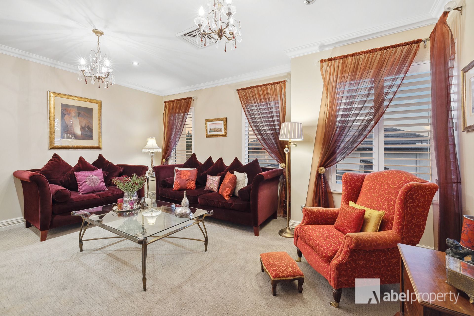 Downstairs, an expansive living area awaits, complete with a theatre-sized alcove and a built-in library adorned with Hampton style shutters. Direct access to the double lock-up garage ensures convenience for vehicle owners.