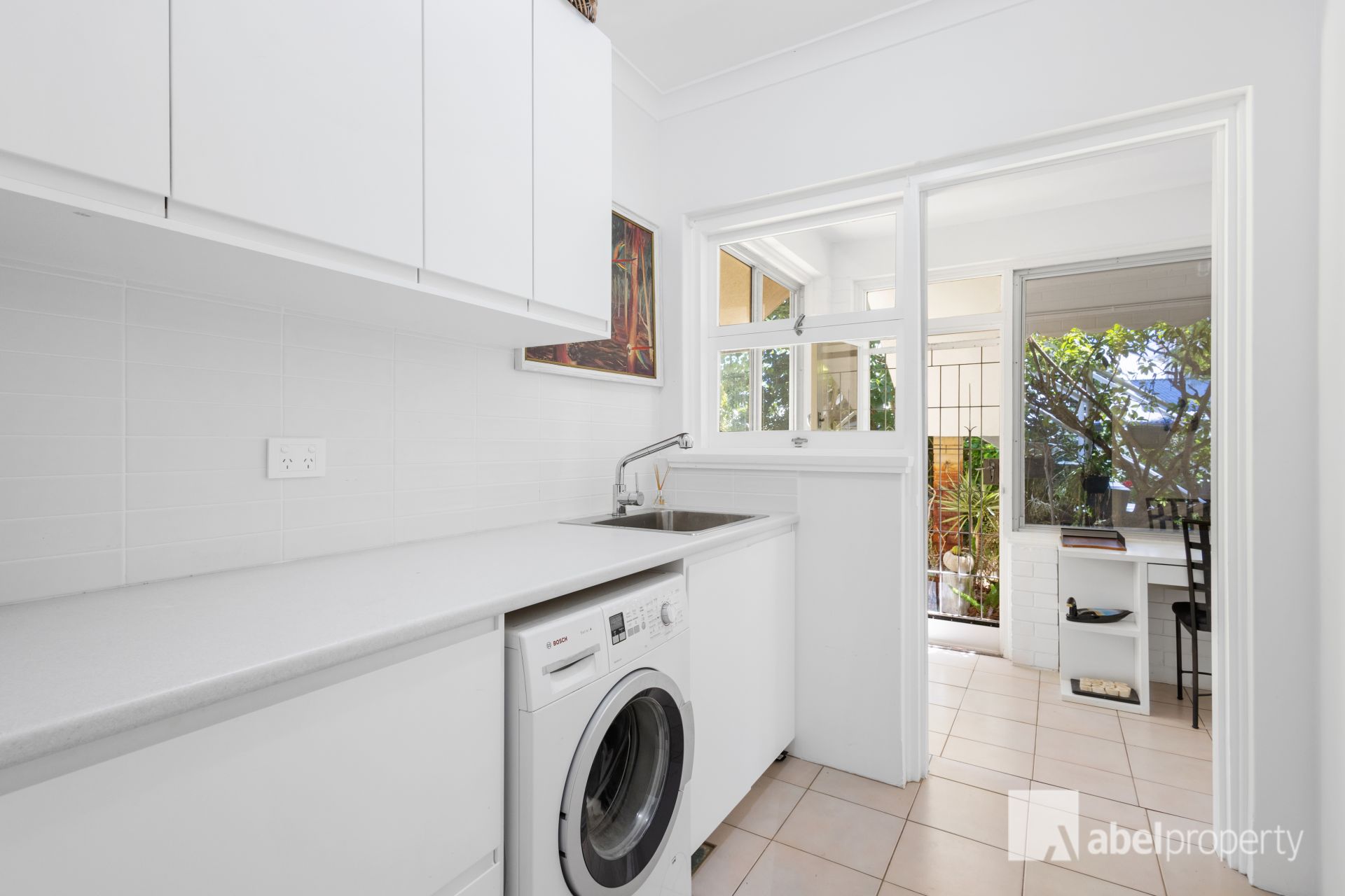 * Bright, clean lined, white Laundry - bench space, under bench and overhead cabinets.