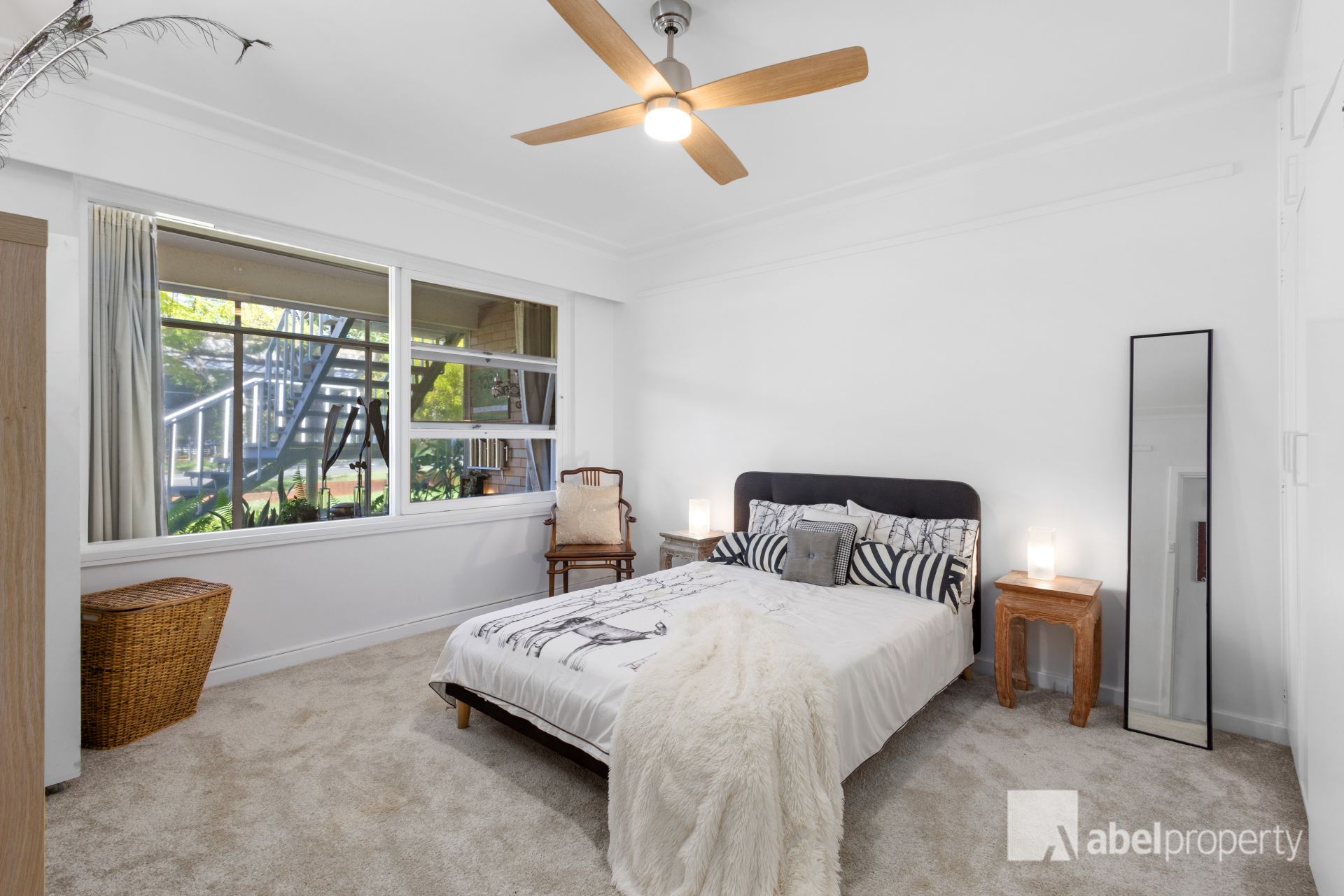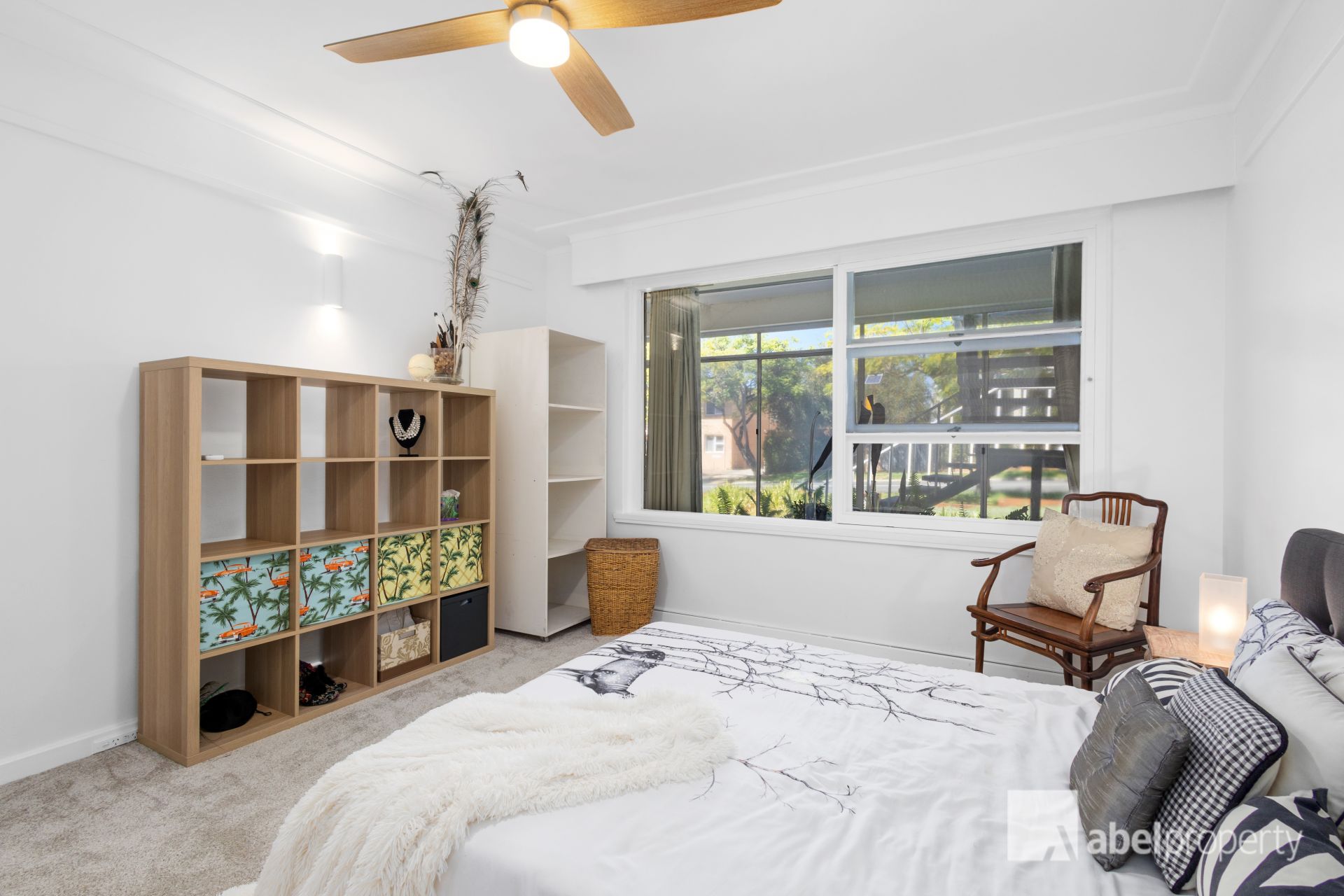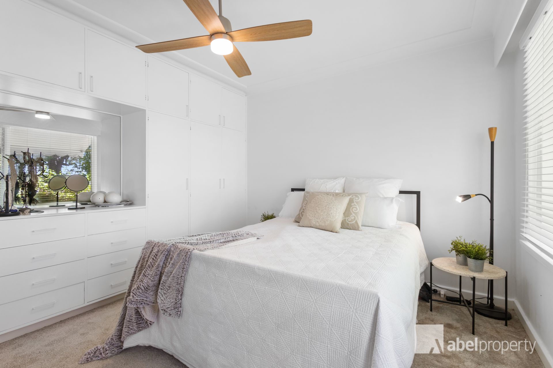 * Window treatments: White sheers, white timber blinds; drapes