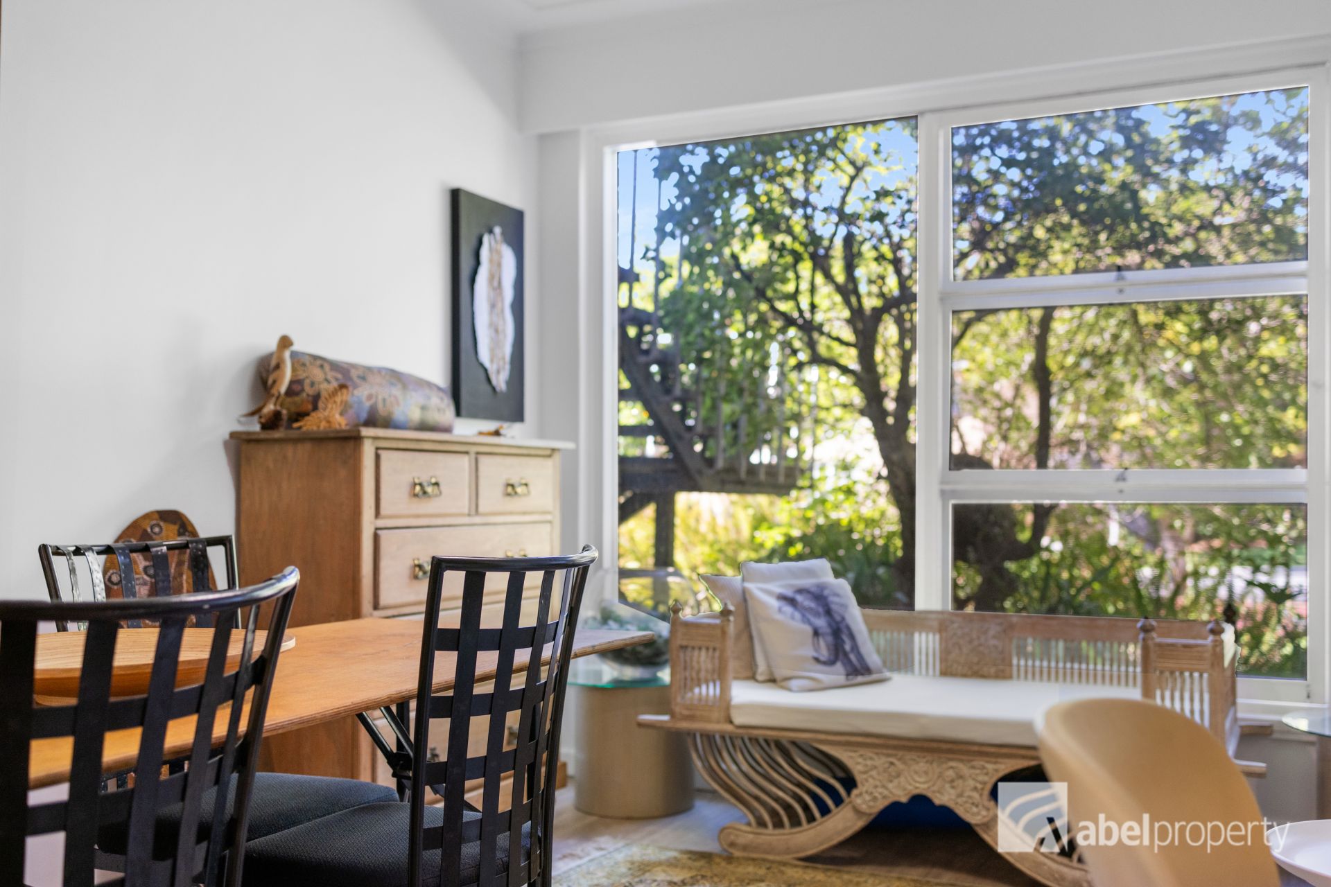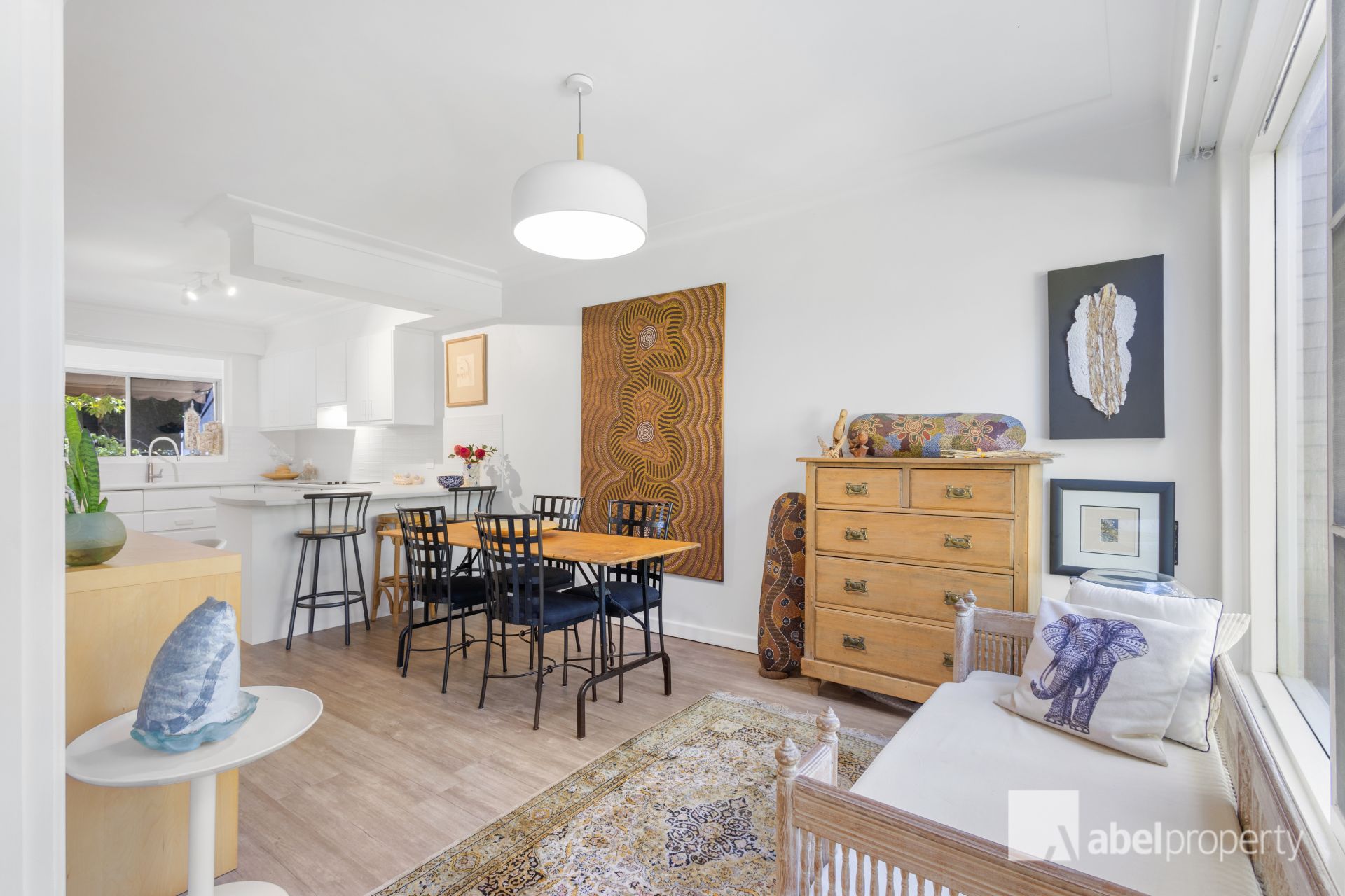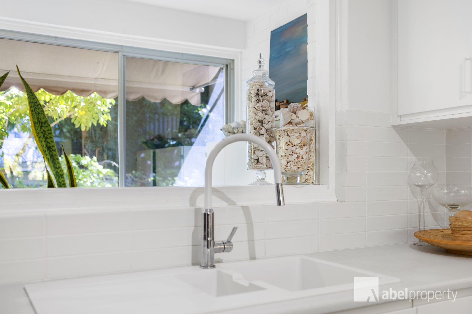 * Window treatments: White sheers, white timber blinds; drapes