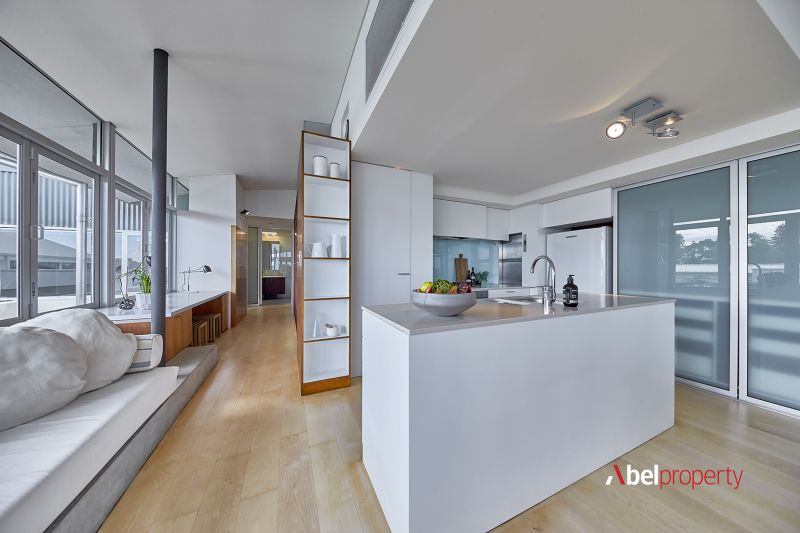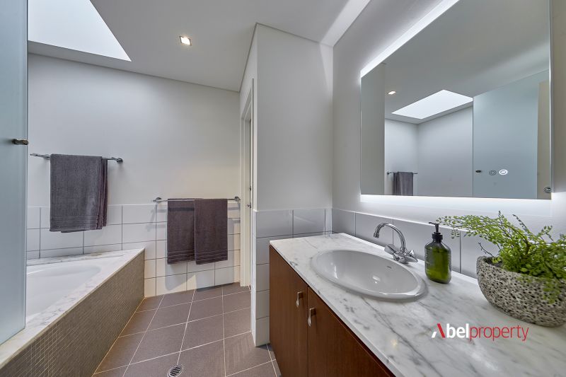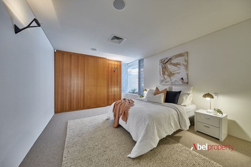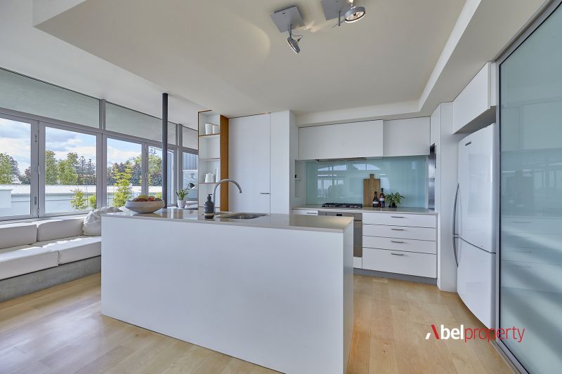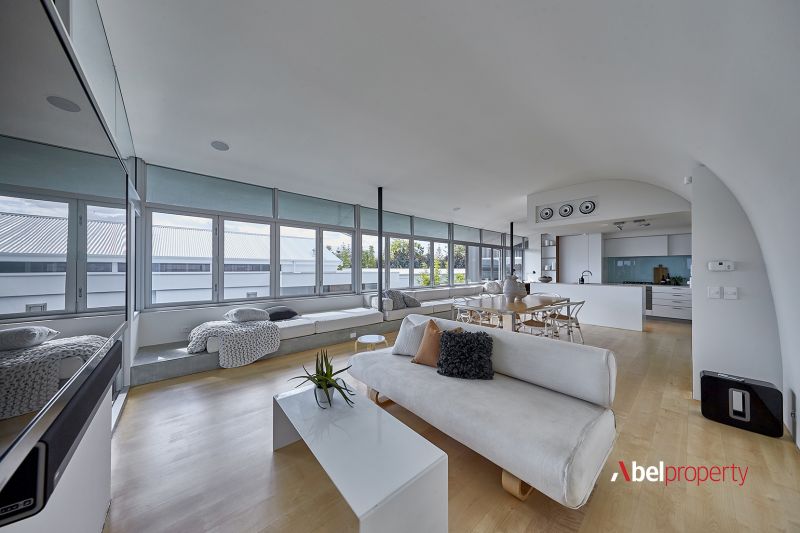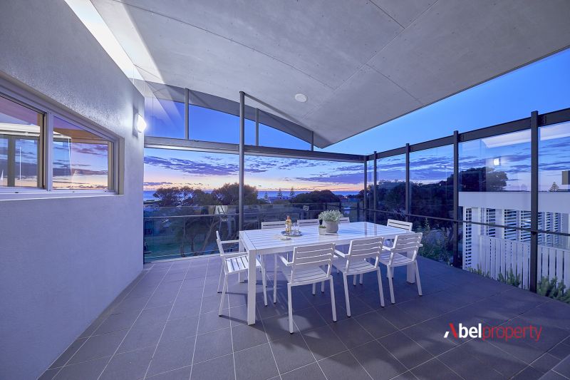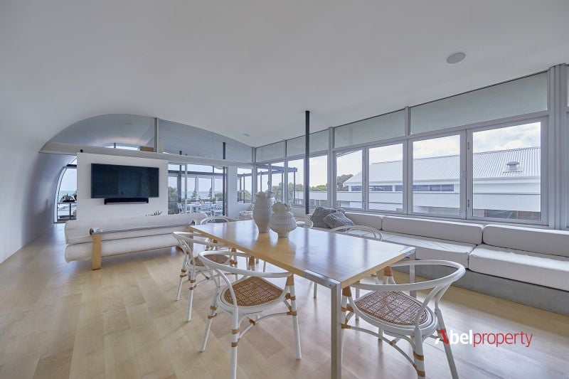 Split across three distinct zones - including two full residences and a separate upstairs studio - this unique home offers remarkable flexibility for multi-generational family living or premium Airbnb returns. At the top, a 2 bed 2 bath retreat features timber floors, a sweeping curved ceiling, panoramic ocean views to Rottnest and a sun-drenched open-plan family, dining and kitchen zone with access to both a study and computer nook, framed by bi-fold northern windows for natural illumination. The curved alfresco-entertaining balcony, built-in gas barbecue, bi-fold security grills and bar area (within the study) are made for summer evenings, sunsets and sensual sea breezes.