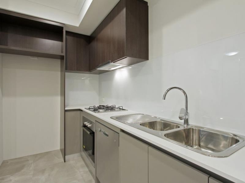 The open-plan living and dining area incorporates a modern kitchen that boasts sparkling stone benchtops, double sinks, a gas stove for cooking, an under-bench oven, an integrated range hood, and a stainless-steel dishwasher for good measure. Leading out to an oversized balcony, this apartment is an entertaining dream.