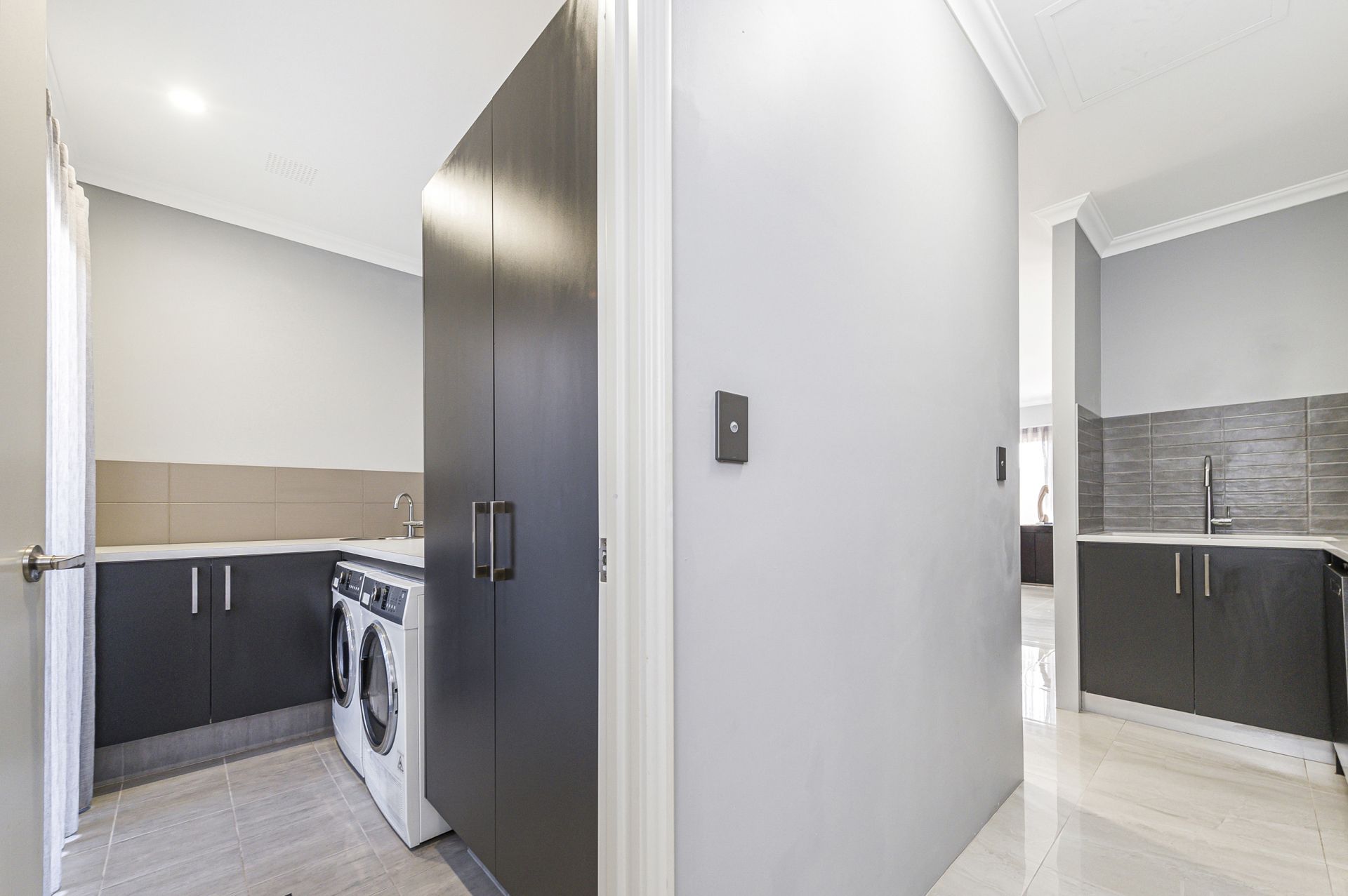 The laundry is well-equipped with ample benchtops and cupboards, a double linen cupboard, and direct access to the outdoor drying yard.