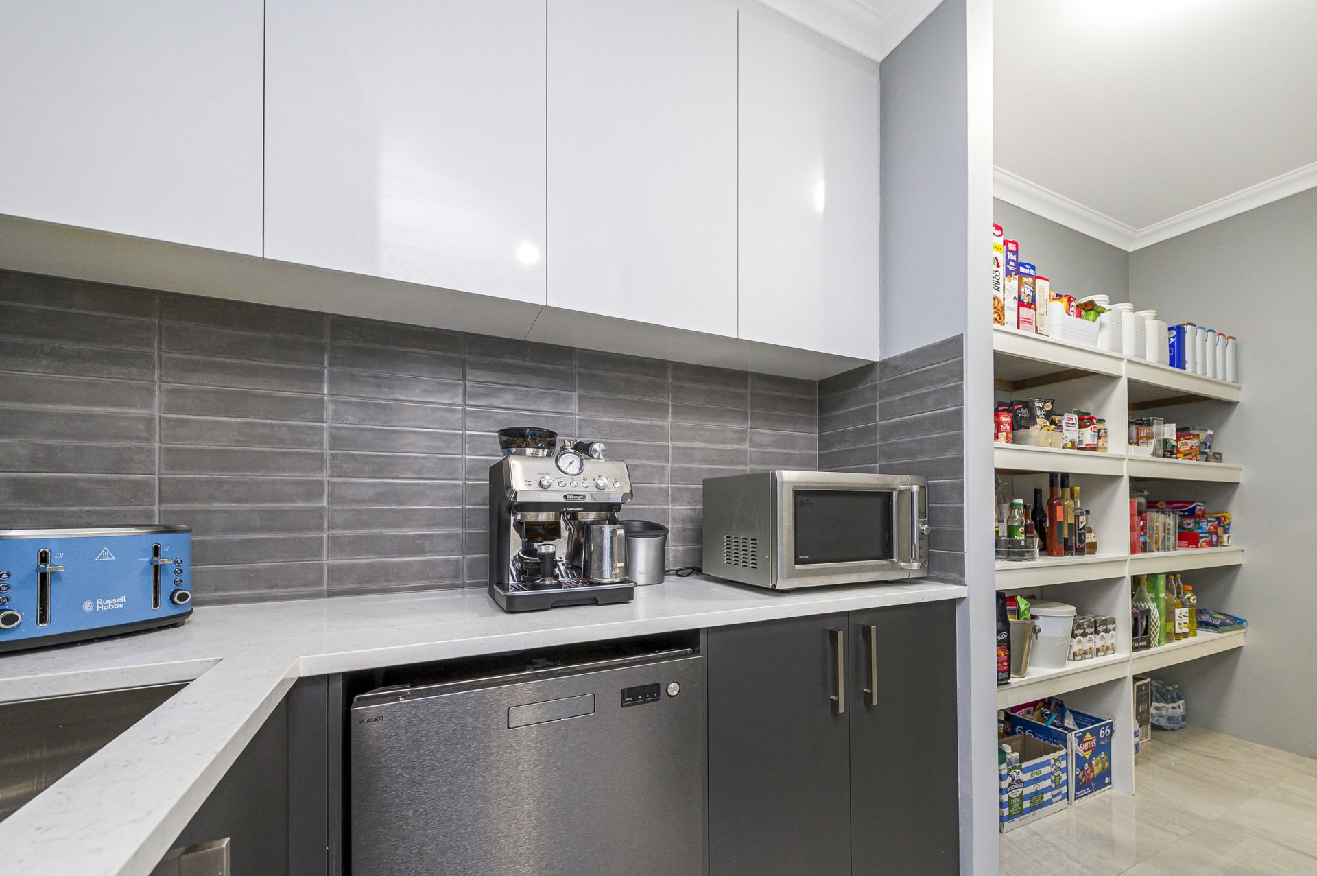 The designer kitchen is the heart of the home, offering stone benchtops, an abundance of drawers and cupboards, 900mm oven and gas cooktop with rangehood, glass splashback, undermount sink, fridge/freezer recess, and feature pendant lighting. The adjoining scullery provides even more bench space, cupboards, a large pantry, and a dishwasher, keeping everything perfectly organised.