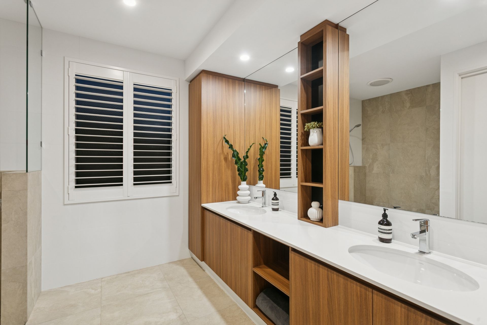 The piece de resistance of the home is the upstairs open-plan family, dining and kitchen area with sublime travertine-tiled flooring, feature recessed ceiling, electric sheer curtains, wooden cabinetry and sliding-stacker doors that extend out to a magnificent alfresco-style entertaining balcony all of which benefit from the natural bush and ocean views on offer.