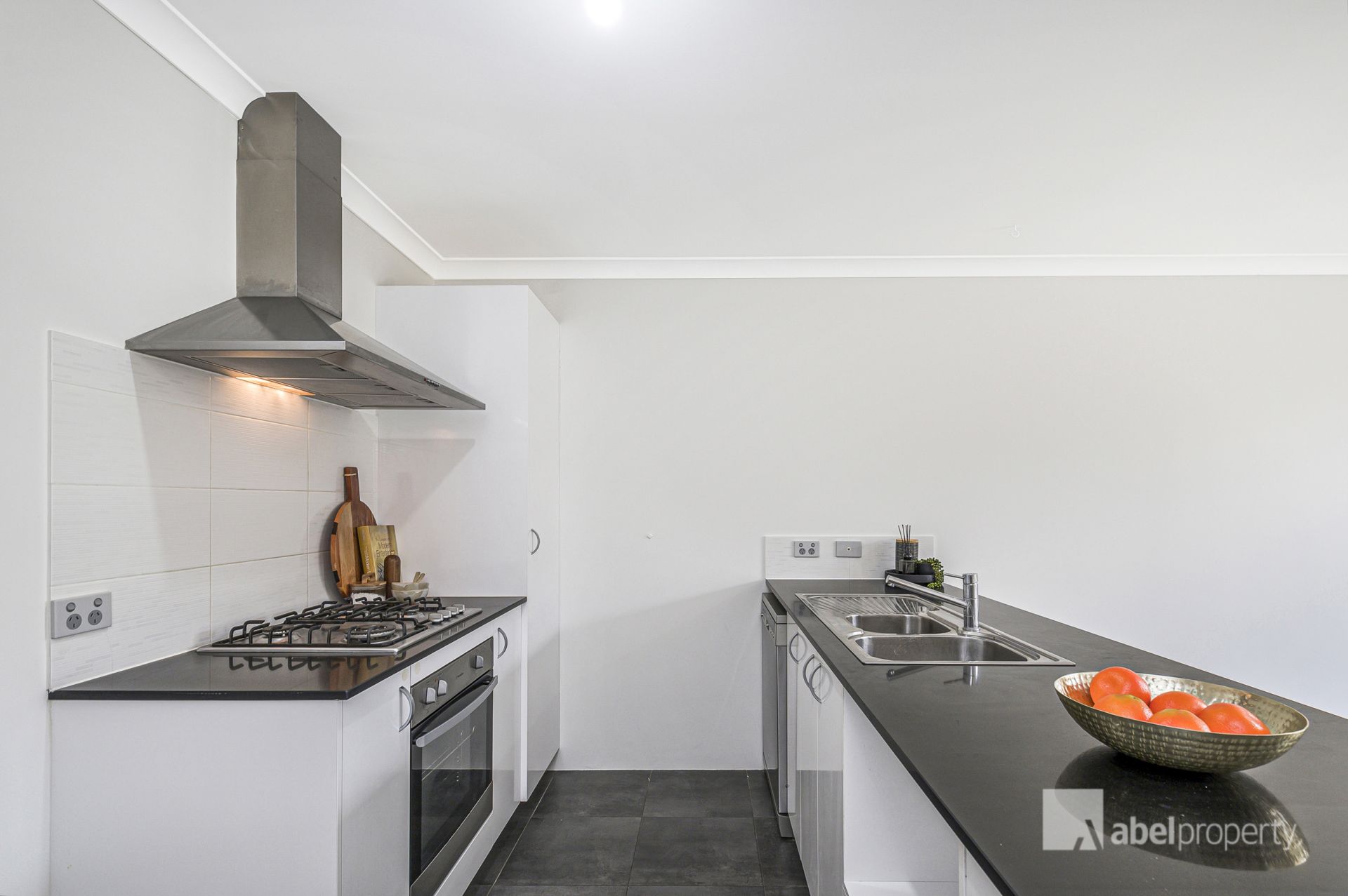 Modern kitchen with stone benchtops, gas cooktop, rangehood, electric oven, dishwasher, pantry, microwave recess and fridge/freezer recess.