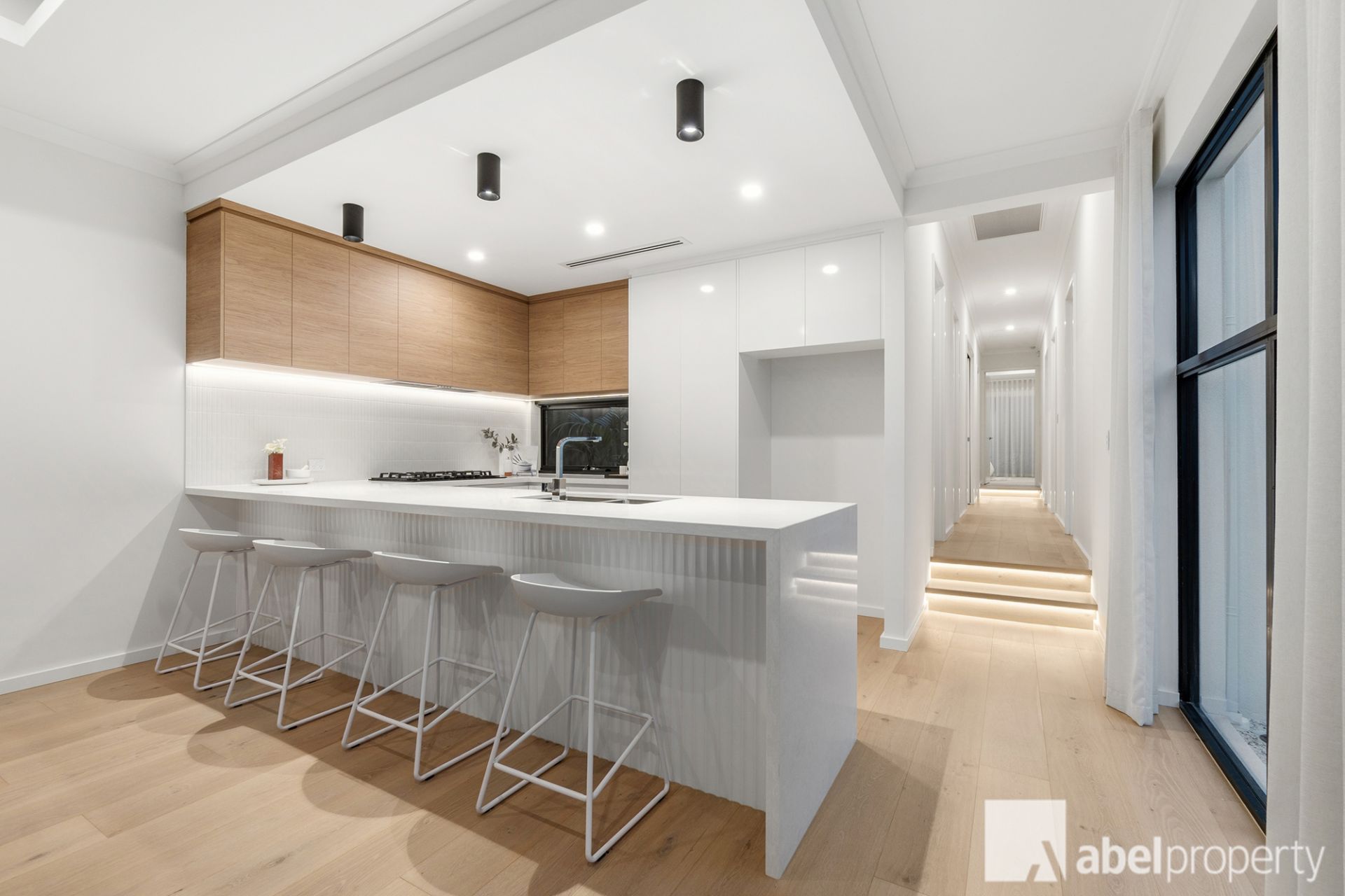The designer kitchen is a true centrepiece, appointed with a stone waterfall-edge breakfast bar, premium 900mm appliances, dishwasher and built-in microwave – seamlessly connecting to the living and dining zones for effortless entertaining.
