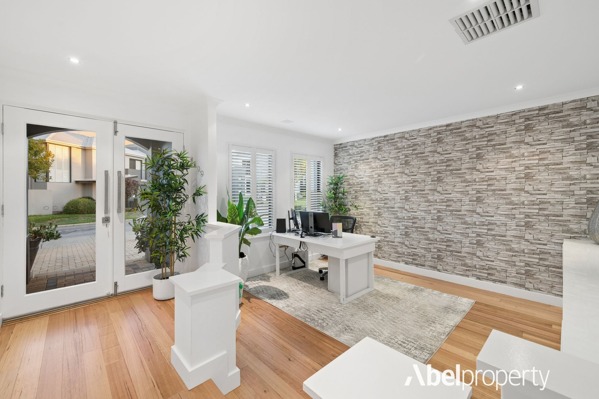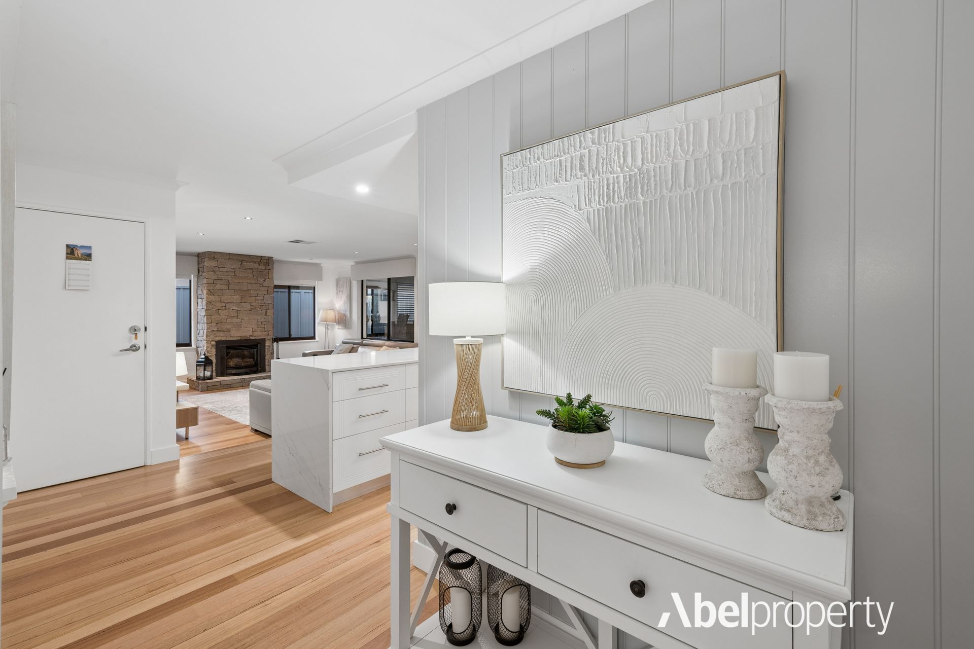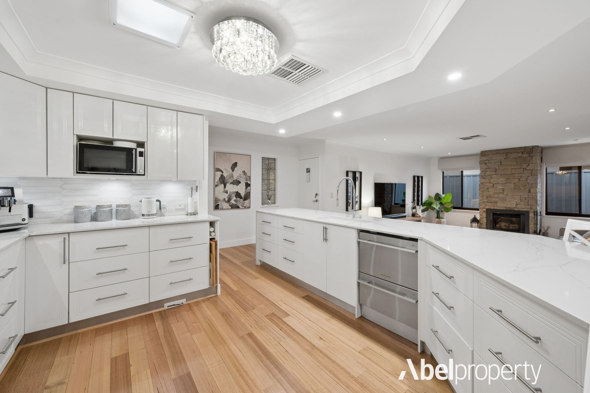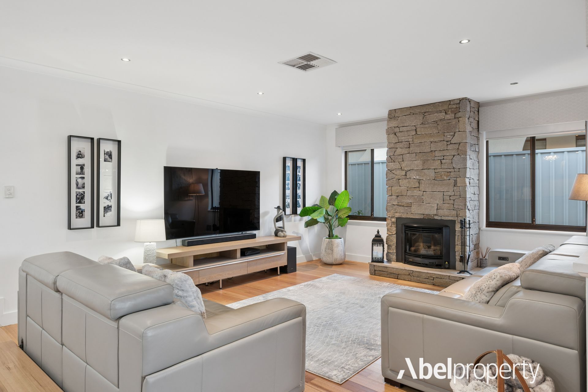 The spacious family room is warmed by a striking stone-built Rinnai gas log fireplace, creating a cosy focal point for winter evenings.