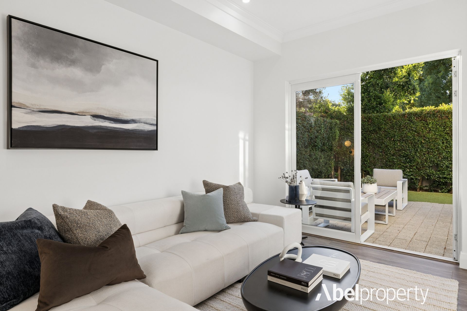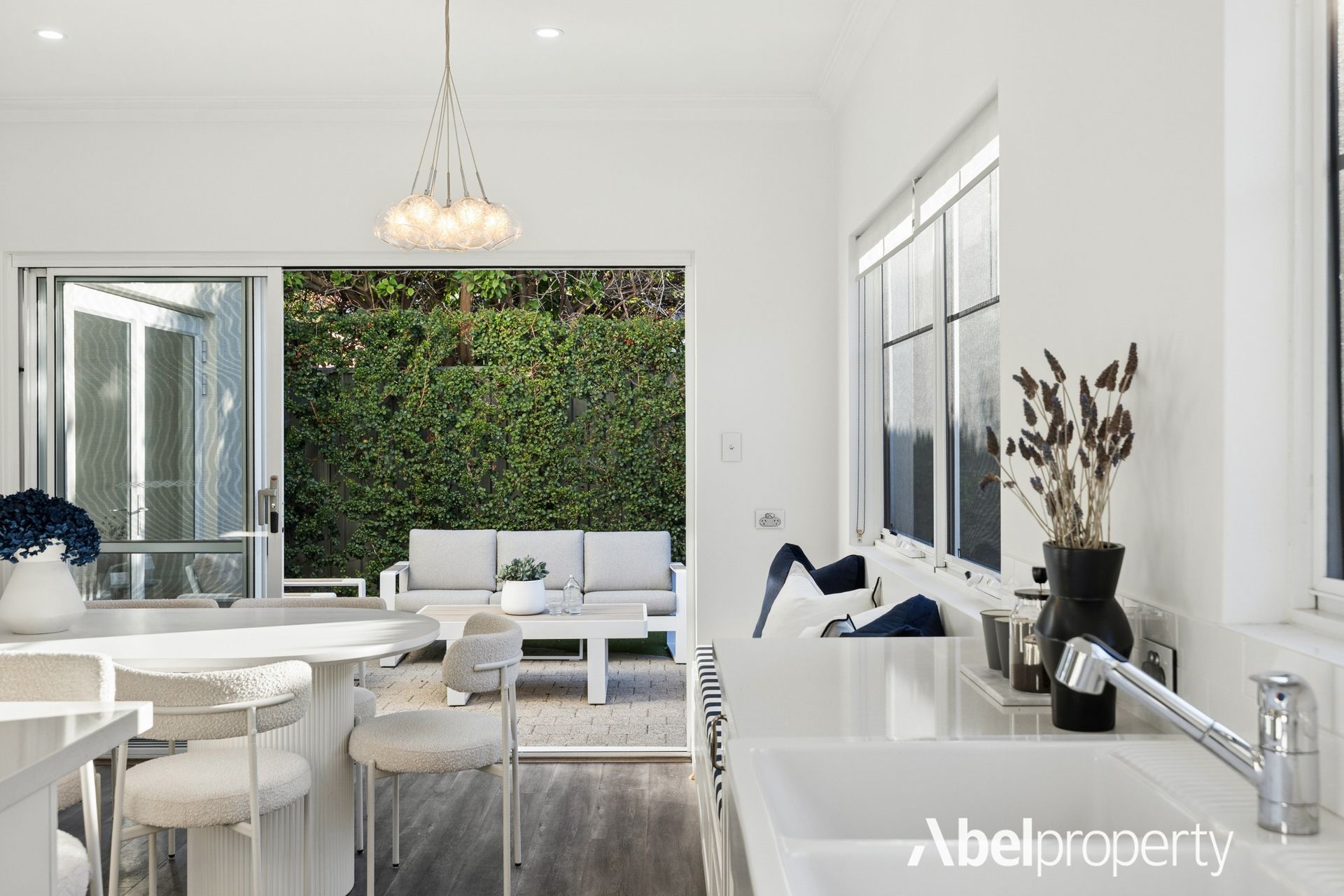 Set back from the street behind a charming façade, the home immediately feels peaceful and secluded. A beautiful stained-glass front door welcomes you inside, where light-filled interiors, fresh white finishes, and warm timber floors create a relaxed and inviting atmosphere.